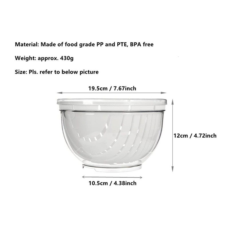 • Package include: Bowl + Colander + Cover. Dimension:19.5x12x10.5cm / 7.67xx4.72x4.38inch. Weight: about 425g