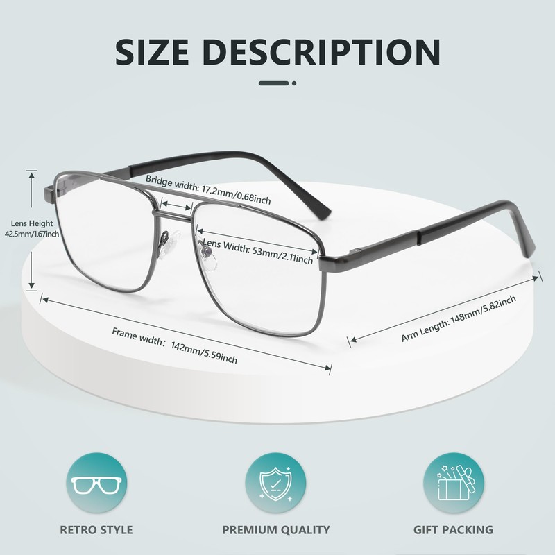 - 【Product Dimension】-Lens width:53.5mm(2.11inch),Lens height:42.5mm(1.67inch),Frame width:142mm(5.60inch),Nose Bridge:17.2mm(0.68inch),Temple length:148mm(5.82inch)