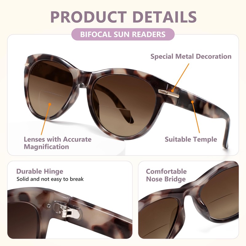 - Vintage Shape and Metal Hinge- The bifocal reader sunglasses for women combine Vintage frame shape with exquisite metal decoration on the sides.Stylish frame design easily embellish your facial curves.Moreover,by adding high stablility metal hinge and inset all-in-one nose bridge,the sunglasses with readers providing you lightweight,comfort wearing experience,meantimely showing your taste for life.