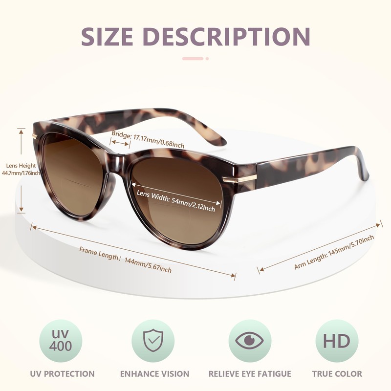 - 2 in 1 Bifocal Design-The bifocal sunglasses for women have the functions of sunglasses and reading glasses in one.Besides,not as other normal bifocal reading glasses,our bifocal part is placed inside of the lens thus no visible bifocal line outside.Wearing it,while blocking the sun, you could also read books or digital device,no need to change the glasses.A pair of glasses can meet you all needs.
