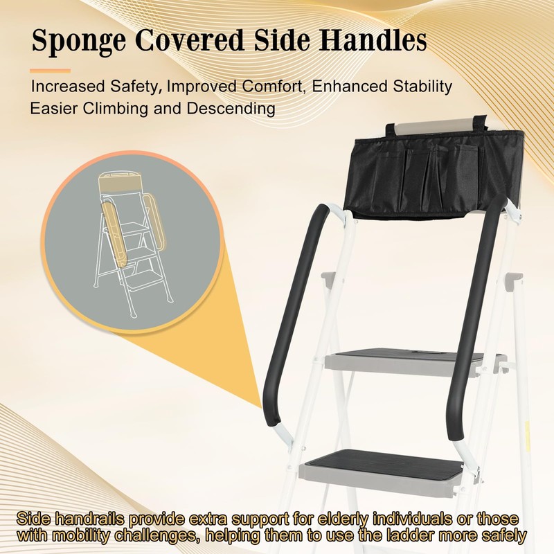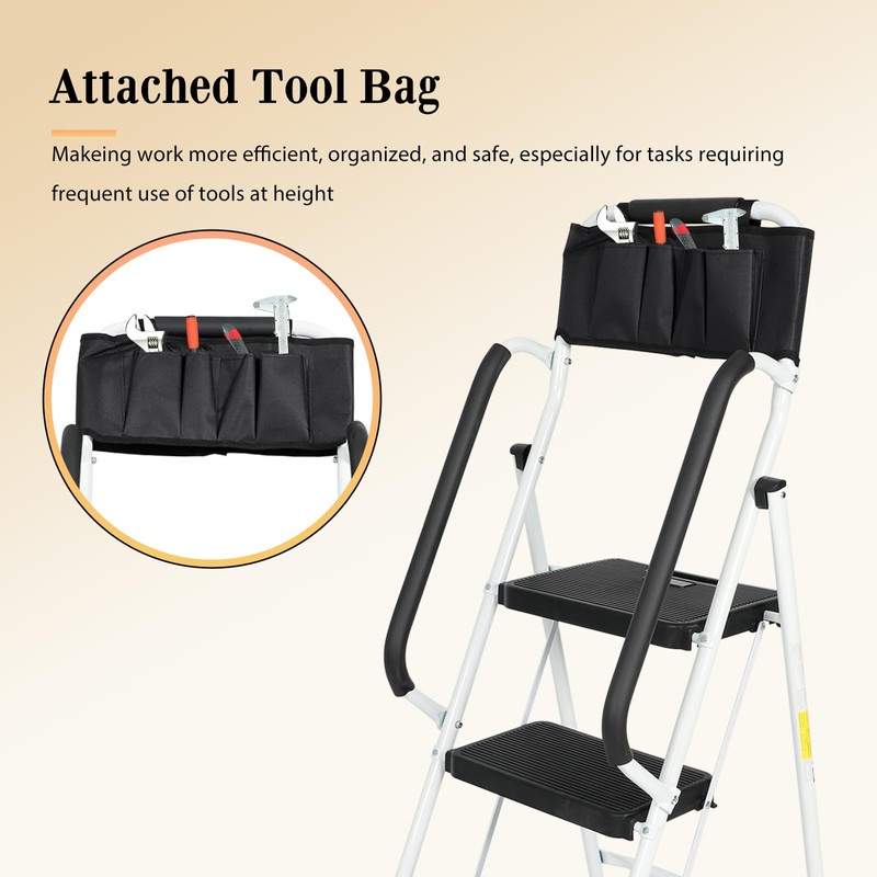 - With the addition of an attached tool bag, our 3 step ladder offers convenient storage for your tools while you work, greatly enhancing practicality. You no longer have to go up and down the ladder to retrieve heavy-duty equipment, as everything you need is within reach