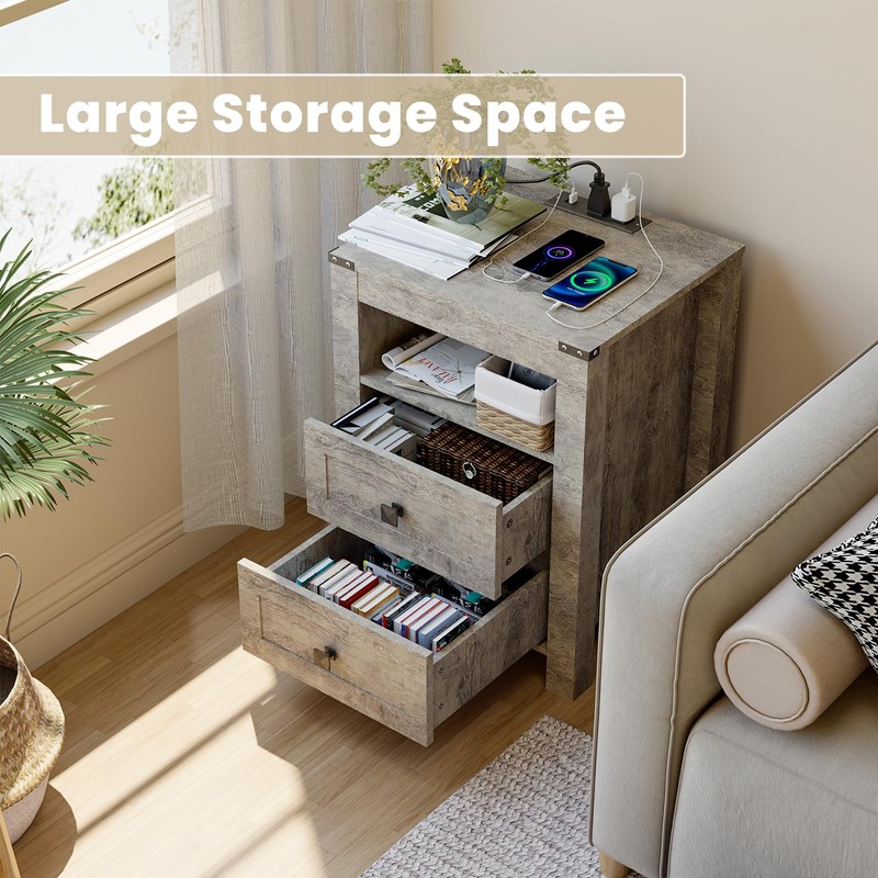 - MULTIFUNCTIONAL END TABLE: The end table living room combines rustic and modern styles that will blend perfectly with your furniture. The compact size of the end table with storage is suitable for many scenarios that can be used as a storage cabinet in the bedroom, living room.