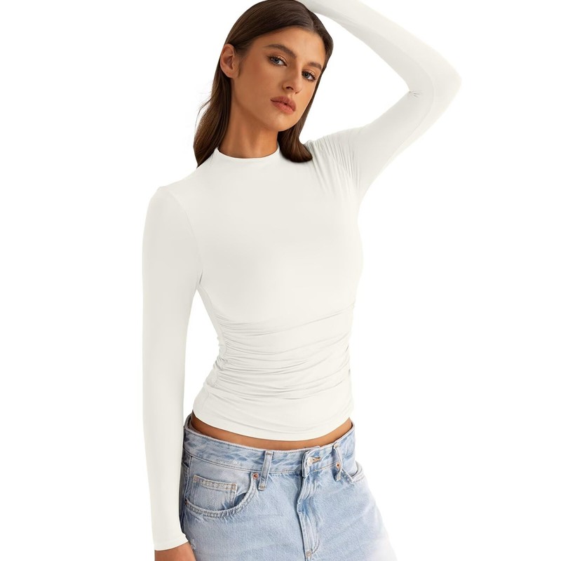 - Ruched Design: Tight long sleeve shirts for women; Mock turtleneck shirts; Side ruched design; Double lined; High-stretch fitted style; Tight underscrub layer; Going out tops; Y2K fashion style, you can wear it alone or wear it as a base layer