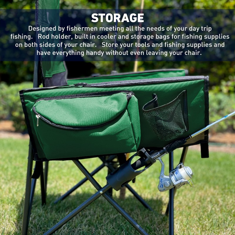 - STORAGE – Designed by fishermen meeting all the needs of your day trip fishing. Rod holder, built in cooler and storage bags for fishing supplies on both sides of your chair. Store your tools and fishing supplies and have everything handy without even leaving your chair. The back of the chair has a built in ruler so you will know if you are meeting local and state regulations.