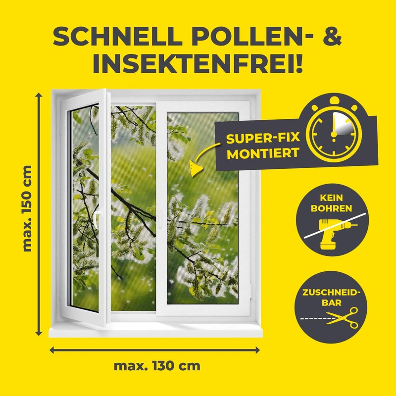 - ✔️ Flexible: The EASYmaxx Insect Protect insect and pollen protection with magnetic attachment can be individually adapted to your needs, because it can be cut to size for all windows up to a maximum of approx. 150 x 130 cm and therefore can be used for many types of windows, including skylights and basement windows.