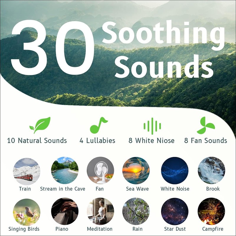 - ♪【30 SOOTHING SOUNDS & 32 LEVELS VOLUME CONTROL】 Our sleep white noise machine has 4 white noise sounds setteing; 4 fan sounds setting; 17 nature sounds setting( 3 rain; 3 water; 3 sea wave; birds; campfeire; train; piano; lullaby; Alpha Wave; star dust; meditation) with excellent speakers and different precise volume.
