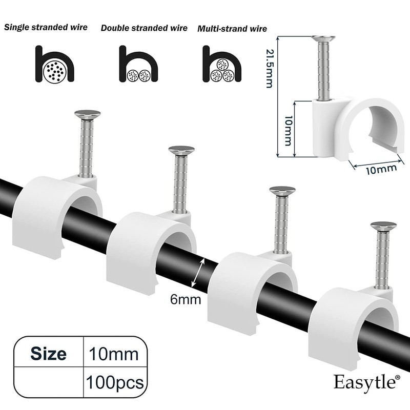 - VARIETY OF USES: Our 10 mm cable tacks are 100 pcs, Ethernet cable clips are applicable to home use, office cable management, electrical wires, Ethernet cables, satellite dish wires, coax cables, USB cables, TV cables. Our cable tacks for wall also for wires are applicable to computer power cords.