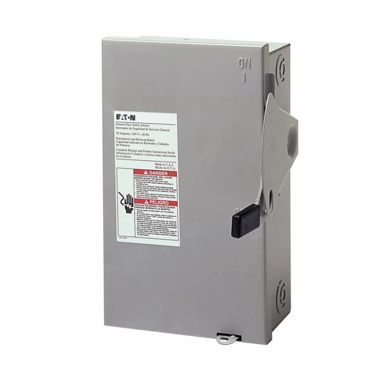 The EATON DG321NGB is a general duty safety switch designed for use in residential and commercial applications. This cartridge fusible safety switch operates at two hundred forty volts AC and supports a thirty amp rating. It is suitable for light duty motor circuits and service entrance applications.