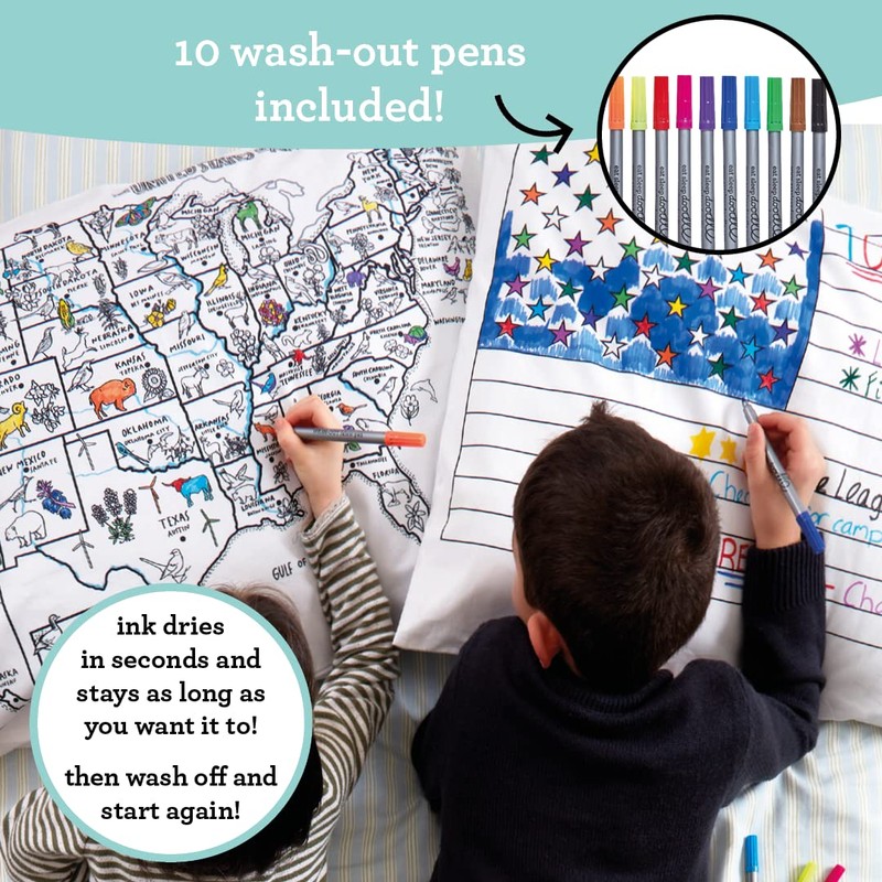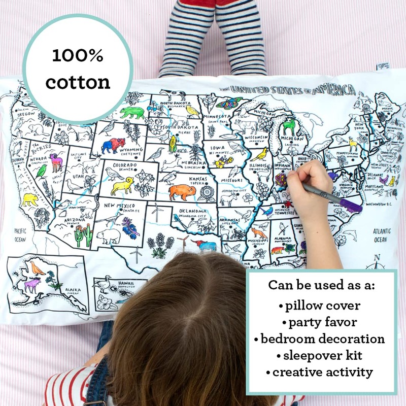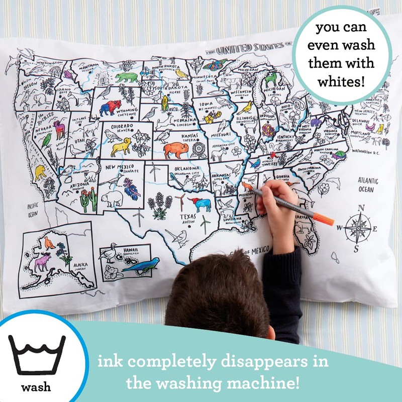- Creative Development - US map educational doodle pillowcase helps develop kids' fine motor skills: the varied shapes and fine lines of the US map design require them to use precise small colouring movements, and the included double-ended pens (one thin end, one thicker) provide extra versatility.