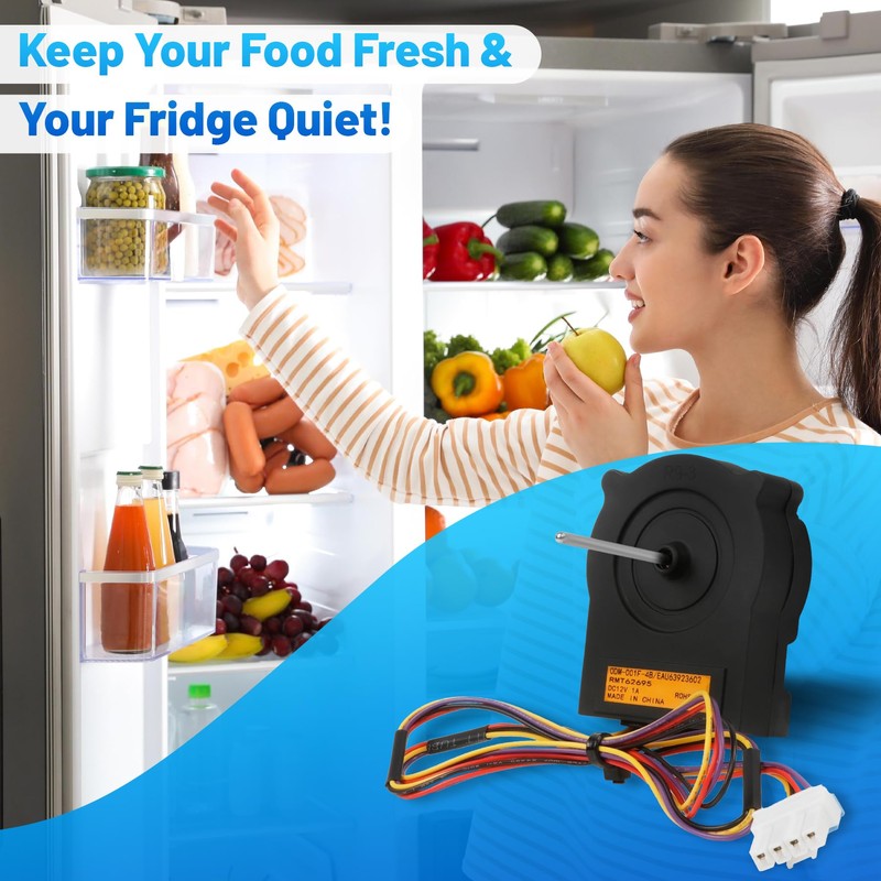 - Premium Fan Motor - The EAU63923602 Refrigerator Condenser Fan Motor delivers exceptional cooling performance through optimized airflow circulation. Engineered with eco-friendly materials, this 12V 1A DC motor ensures pollution-free operation while maintaining food safety standards.