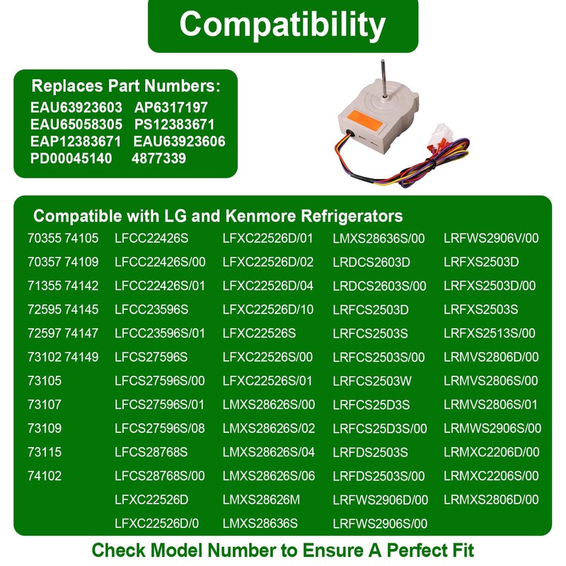 - 【Product Function】✔Heat Dissipation:The Replacement Condenser Fan Motor helps dissipate heat generated by refrigerator operation, contributing to efficient operation and preventing overheating.✔Noise Reduction:The EAU63923603 fan motor runs quietly, ensuring comfort in the kitchen or surrounding living space.✔Keeps food fresh: Discharges heat from the inside of the refrigerator to the outside, accelerating the cooling of the internal air for more balanced cooling