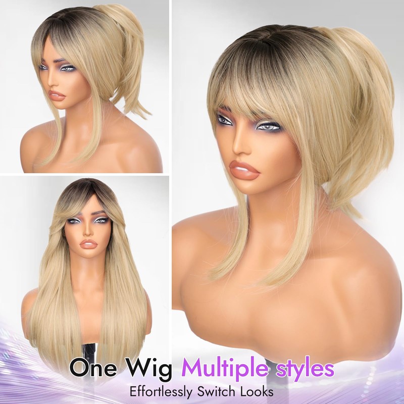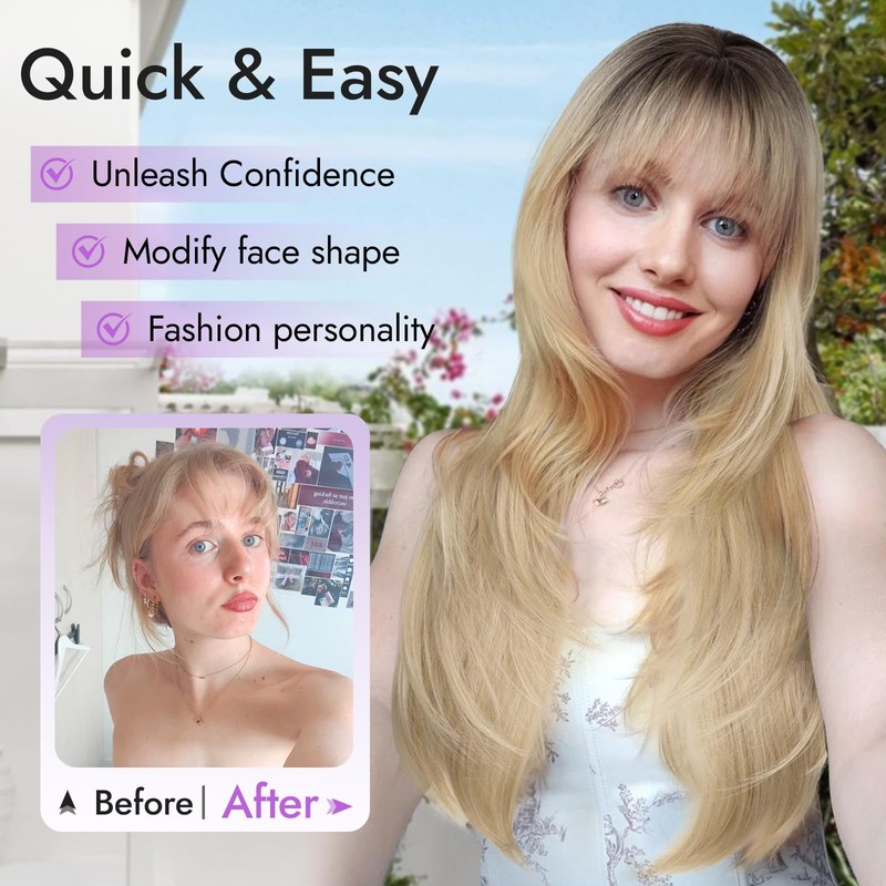 Eawwii Long Blonde Wig with Bangs for Women- Dark Root to Blonde,4x4 Realistic Scalp,Free Parting,Layered Hairstyle Synthetic Heat Resistant for Daily Party Use 26 inch