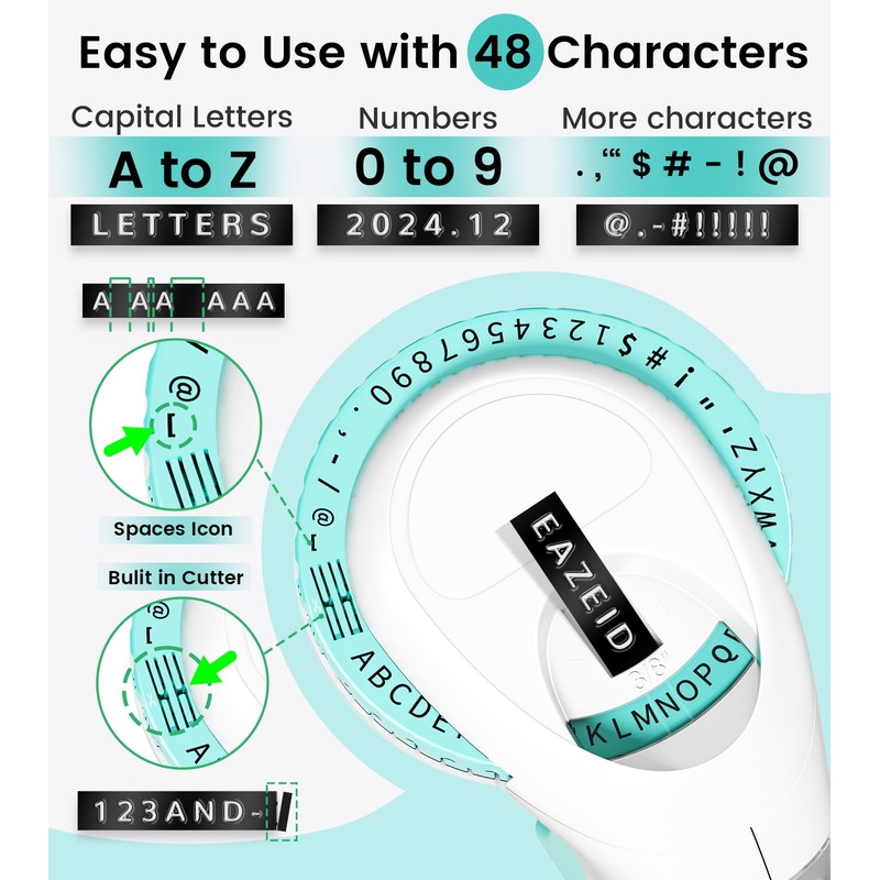 - 48 Useful Characters : With the etiqueteuse embossing dials, this special EazeID personal labeler machine includes all the essential characters. English letters "A TO Z", numbers : "0 to 9 " , and common symbols " . , !‘“ $ # - ! @ ", it covers all your labeling needs