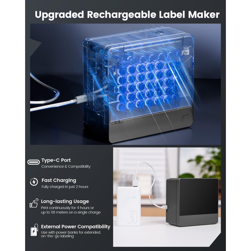 - 【Durable Power, Always Ready】 The P780BT is built to last with its 1200 mAh battery, providing up to 4 hours of continuous printing on a single charge - enough to cover 118 meters of labels. It recharges in just 2 hours and can be used with a power bank for portable, on-the-spot labeling without running out of juice