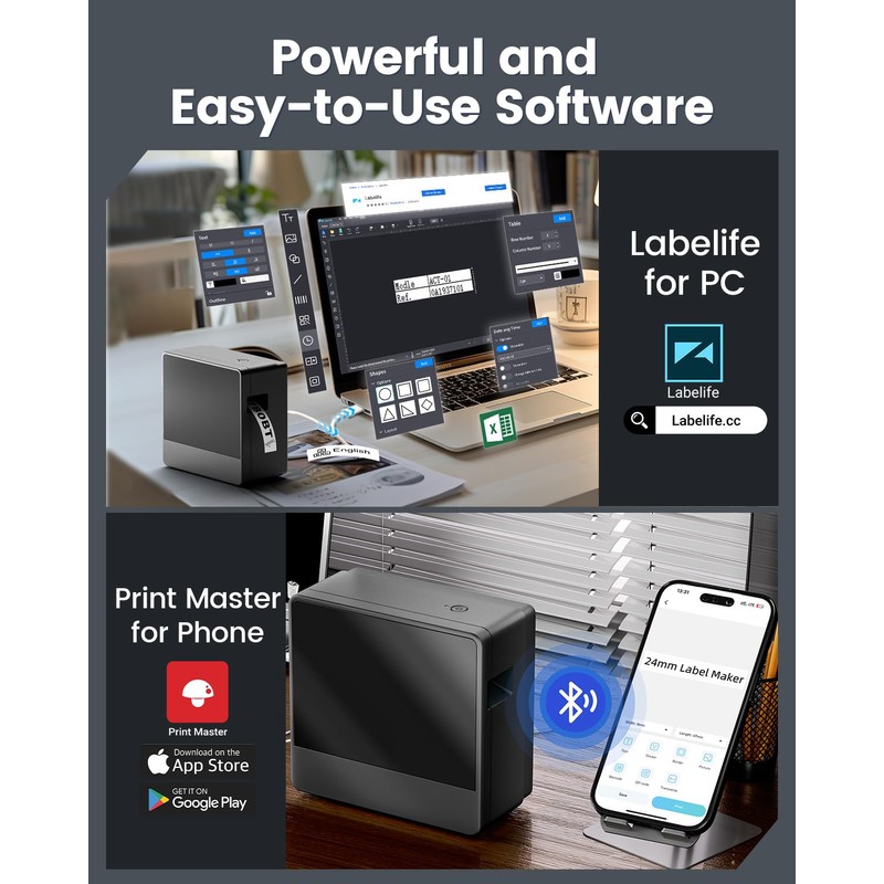 - 【User-Friendly Software】Compatible with "Phomemo" Label Maker APP. Are you frustrated with complex label editing software and unreliable Bluetooth connections? The P780BT Label Maker comes with the easy-to-use Labelife software for PC and the Print Master app for Smart Phones. This ensures a seamless setup and printing experience, making it the ideal solution for effortless label creation