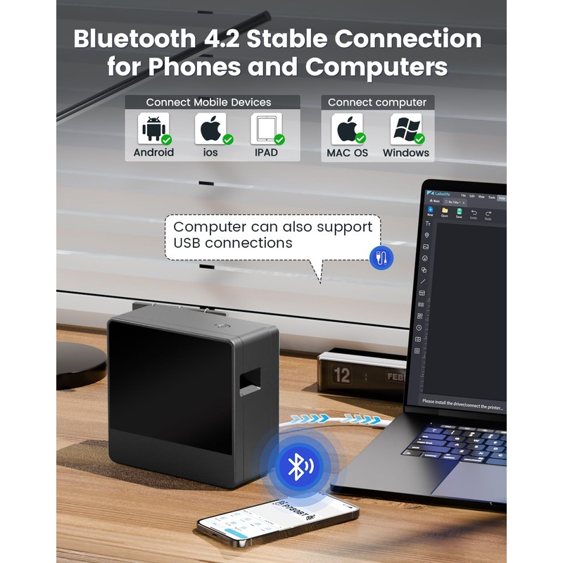 - 【Omni-Compatible Bluetooth】 Unlike other label makers that only support Bluetooth connections with phones, the P780BT offers high-compatibility Bluetooth connectivity with both smartphones and computers (also supports USB connection to computers)