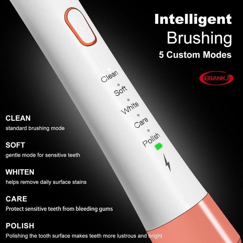 - Five electric sonic toothbrush modes: Customize your oral care with soft, white, care, and polishing modes, each generating powerful sonic vibrations to effectively clean gum care and plaque removal. Compared to manual toothbrushes, this electric toothbrush can improve gum health by 100% and help reduce tooth decay