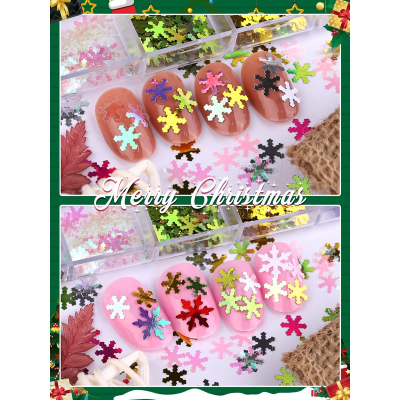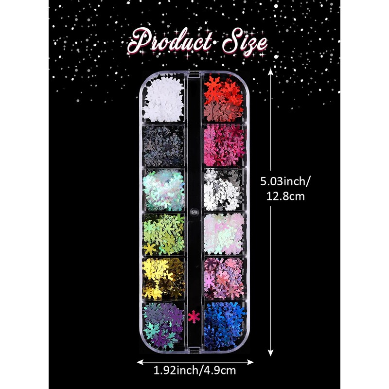 - Snowflakes Nail Glitter:12 colors Christmas snowflakes holographic nail sequins, each color is packed in a grid carton, with good sealing to protect them from leaking. It is easy to use, store and carry.