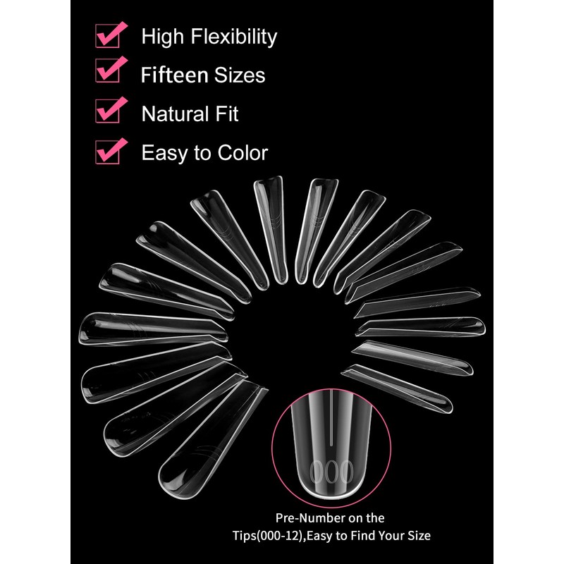 - 【Nagelform in 15 Größen】 150 Stück Doppelformen für Polygel bieten 15 verschiedene Nagelgrößen, und jede Größe der langen Nagelspitzen ist durch ein kleines Gitter getrennt, insgesamt 15 Gitter, sodass Sie einfach und bequem die passende Größe für Ihre Nagelbedürfnisse auswählen können.