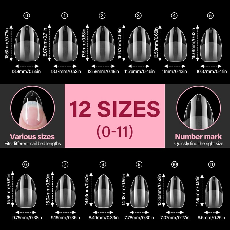 - 【Quickly Find the Right Size】This 360PCS false nail tips set comes in 12 sizes for effortless matching to each finger. Each nail tip is labeled with a size number and in the transparent series features a thinner edge to fit your natural nails. The pre-filed design reduces the need for extensive filing. Ebanku nail tips offer a more natural appearance, resembling nails that have grown out naturally.