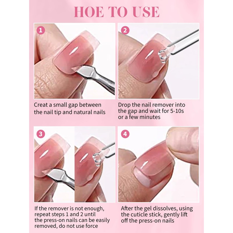 • Odorless & Convenient: Our gel glue remover is odorless and works with a cuticle pusher for easy, mess-free application. No soaking required—just apply, wait, and gently lift off glued-on nails.