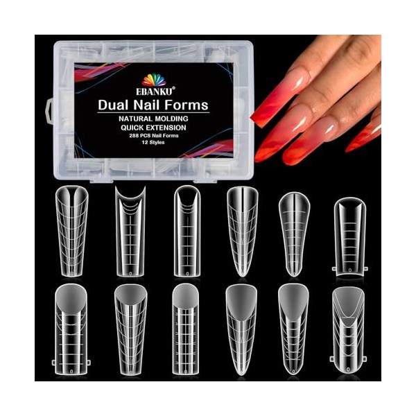 EBANKU EBANKU Dual Forms for Poly Nail Gel 288PCS Dual Nail Forms Molds Stiletto Coffin Ballerina Acrylic Nail Tips 12 Shapes for Builder Gel Manicure Nail Art Design Salon DIY at Home