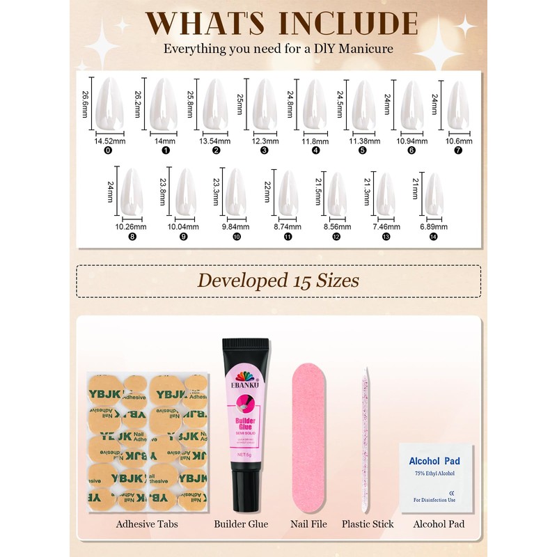 - WHAT IS INCLUDED: EBANKU chrome gel nail tips with design in 15 nail sizes ensure a completely customized fit, and we give you everything you need for just in case! Each kit includes a storage box, 5g of construction glue, adhesive strips, a double-sided nail file, a plastic pen and a prep pad