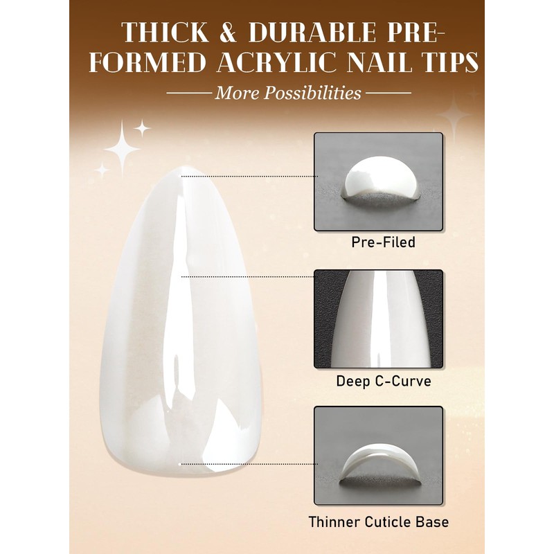 - QUICK PRE-REINFORCEMENT FOR FLAT NAILS EBANKU almond shaped false nails come with a pre-made reinforcement tip and pre-filed bottom for adhesion as well as the C curve, eliminating the tedious work of tricky building, nail extension and shaping. The tips of the almond shaped press-on nails fit better with your natural nails and give your nails a fuller look