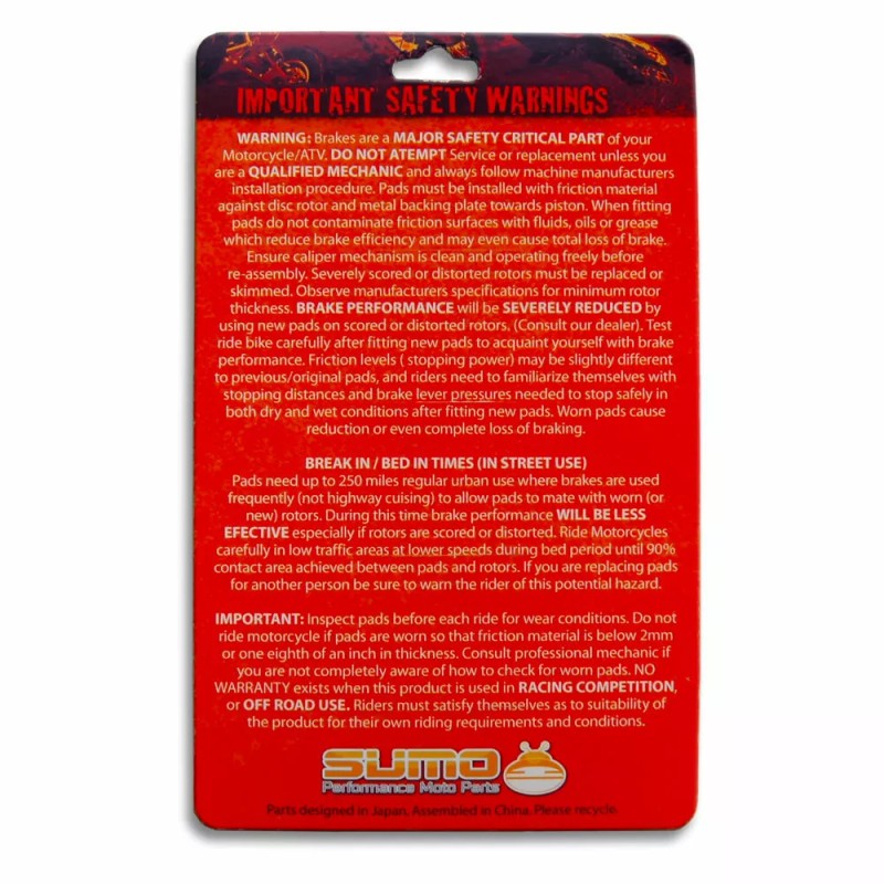 - Nuevas Pastillas de freno. Estas pastillas orgánicas están hechas con fibras artificiales o sintéticas unidos con una resina petroquímica. Sumobrakes pastillas orgánicas han atraído a muchos aficionados debido a su forma de trabajar. Son intrínsecamente más "suaves" más fácil en los rotores y tienen un freno "sentir" preferido por muchos ciclistas.Sumobrakes ha pasado una y otra vez las pruebas de calidad. Demostrando que Sumobrakes ha superado a la mayoría de otras pastillas orgánicas en comparación a seguridad de freno y nivel de fricción. Este material de alto rendimiento impresiona. Nuestra empresa se ​​enorgullece de proporcionar a nuestros clientes un producto de alta gama a un precio excelente. Enviamos rápidamente a todo el mundo. ¡Sí! enviamos a su país! Consulte en español. Gracias.