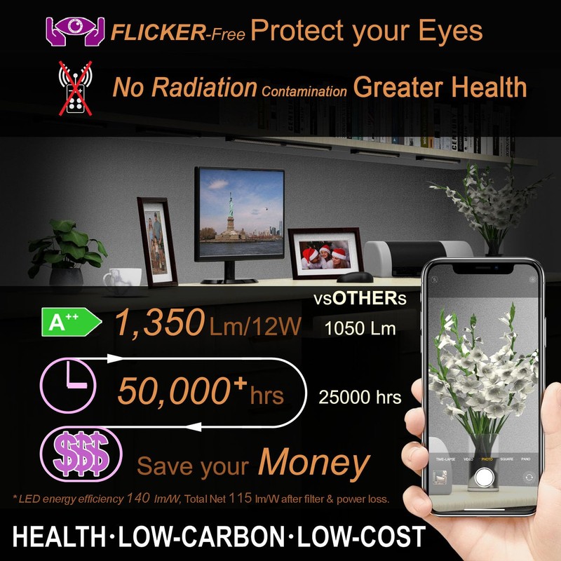 - 【SUPER Dimmer】Touch Dimmer on and off, placed on the Dimmer to adjust the brightness from 10% to 100%, The Memory Function will Remember your brightness settings and on or off status, Even if you disconnect the power and reconnect, it will still remember the previous settings, This feature is perfect for TIMER & SMART PLUG, which is NECESSARY for over sink light to enter the DIGITAL AGE.