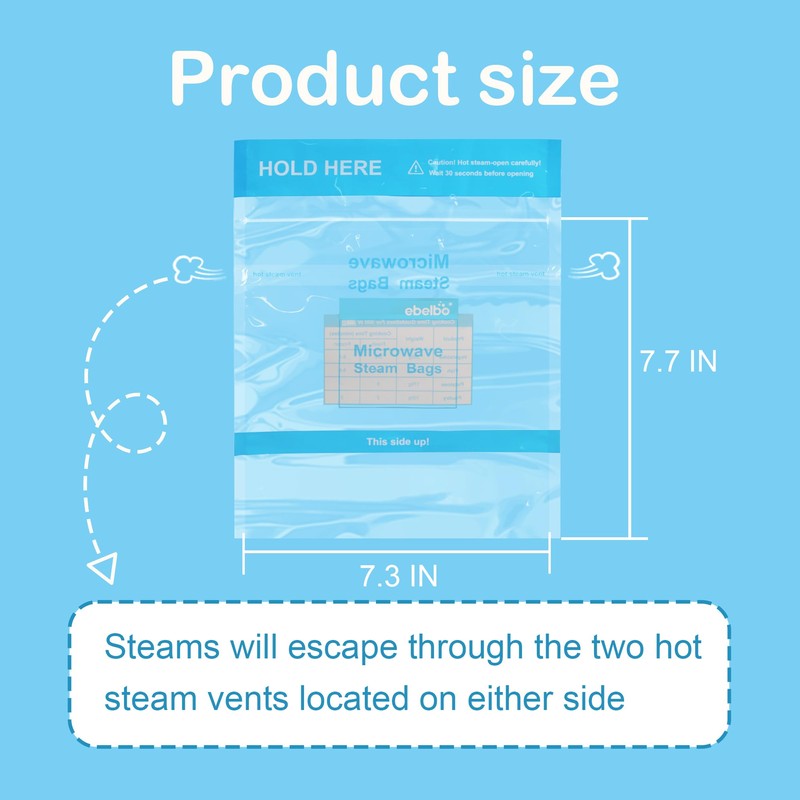 - [Thoughtful Design] Each bag has specially designed hot steam vents on both sides of the bag to ensure the discharge of steam during cooking. You don't need to worry about the microwave steam bag expanding during cooking, you can use it with confidence