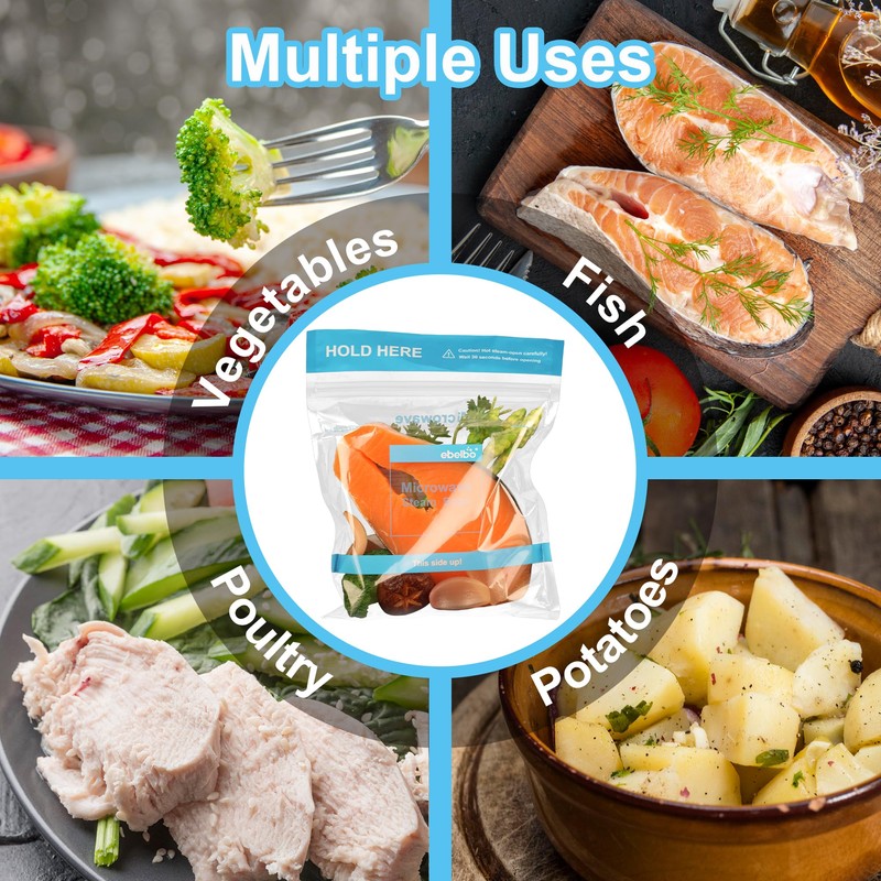 - [Multiple Uses] The steam bag can be used to steam a variety of fresh or frozen foods, including potatoes, vegetables, fish and poultry. And it is suitable for various occasions such as daily cooking at home, gathering with friends, office or traveling