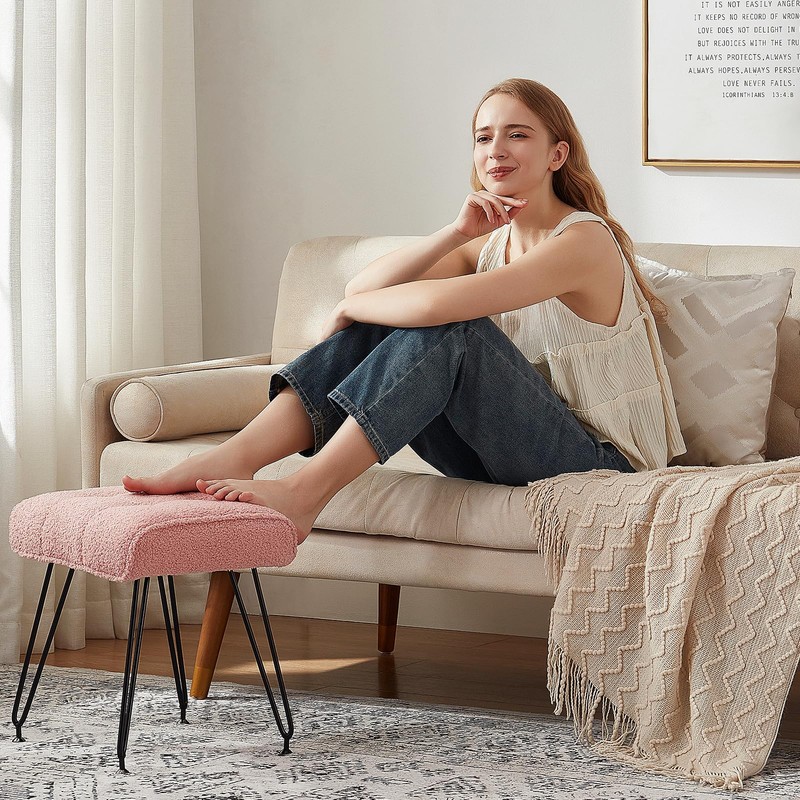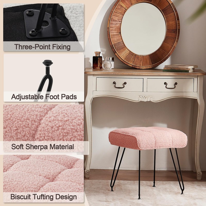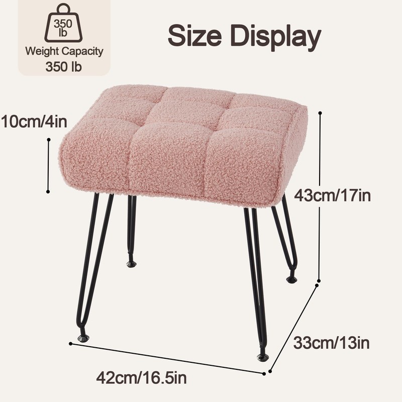 EBENCHICO Sherpa Vanity Stools, Teddy Fur Foot Stools Ottoman with Metal Leg Vanity Stool Chair with Padded Seating Make up Chairs for Small Bench Seat for Living Room Bedroom (Pink)