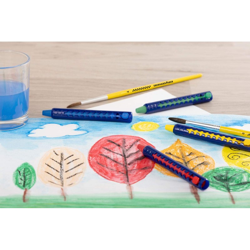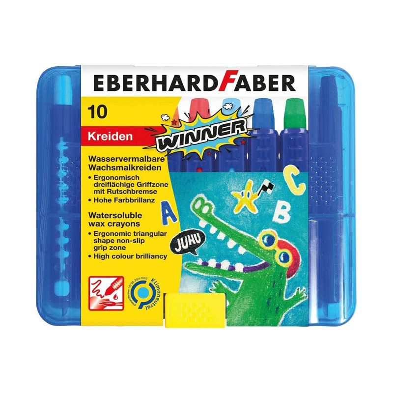 - Contents: 10 water-soluble wax crayons in soft, bright colours and a scraper in a sturdy plastic box with name field