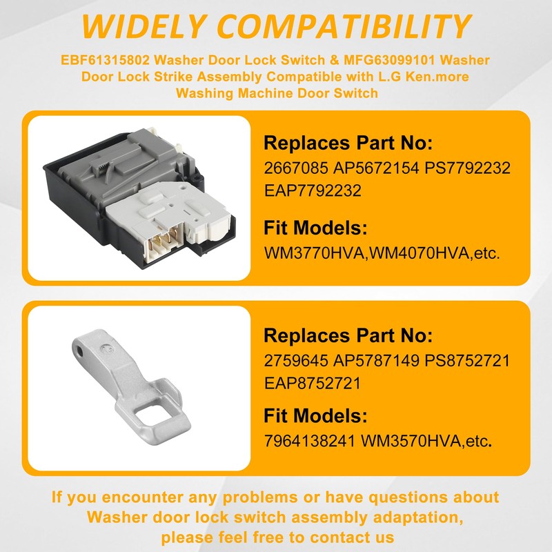 EBF61315802+MFG63099101.Washer door lock switch assembly is made of high-quality sturdy material,which has good abrasion resistance and ensures long-term effective operation.This dynamic duo brings together two high-quality, versatile productsdesigned to enhance your daily life. Whether you're looking to upgrade your homeappliances, improve your workspace,or simply add convenience to your routine, this combo set has everything you need.Upgrade your daily life with the EBF61315802+MFG63099101 combo set. This dynamic duo offers unparalleled performance, versatility, and convenience, making it the perfect choice for anyone looking to enhance their home or workspace. Order yours today and experience the difference for yourself ! l.g EBF61315802 Washer Door Lock Switch assembly repalces 2667085 AP5672154 PS7792232 EAP7792232,compatible with various L.G washers such as 79641072310,79641182310,79641283310,79641383410,79641573210,79641182311,WM3570HVA,WM8000HWA,WM4070HVA,WM3370HRA,WM3370HWA,WM4270HWA/00,WM3370HRA/00,79641282311,79641482410,79641583410,WM5000HWA,WM9000HVA,79641262610,79641303610,etc.MFG63099101 Washer Door Lock Strike Assembly repalces 2759645 AP5787149 PS8752721 EAP8752721,compatible with various L.G&Ken.more such as 79641283310,79641383410,WM3570HVA,WM3370HVA,WM4270HVA/00,WM3170CW/00,WM3370HVA/00,WM3570HVA/00,79641282311,79641482410,WM3370HWA/01,79641262610,79641302610,WM3670HWA,WM4270HWA,79641162411,WM3370HRA00,79641393510,79641483411,79641583411,WM4270HVA/01,79641392510,etc Before installing the EBF61315802 lg washer door lock switch simply unplug the washer and wear protective gloves for safety!