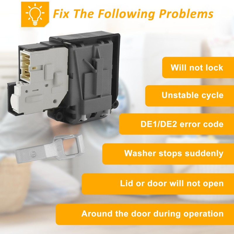 • Package Include:1×EBF61315802 Washer Door Lock Switch assembly;1×MFG63099101 Washer Door Lock Strike Assembly.L.G Washer Door Lock Switch Assembly fixes washer not starting/locking, stopping, washer lid opening during washing and spinning, door lock closing, DE1/DE2 error codes
