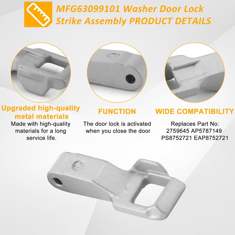 • Replaces Part No:l.g EBF61315802 Washer Door Lock Switch assembly repalces,2667085, AP5672154,PS7792232,EAP7792232,796.41262.610.MFG63099101 Washer Door Lock Strike Assembly repalces 2759645,AP5787149,PS8752721,EAP8752721,796.41262.610