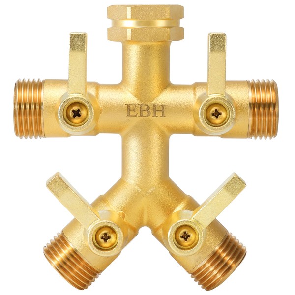 EBH Brass Garden Hose Splitter Full Flow, Outdoor Faucet Heavy Duty Hose Splitter 4 Way High Flow, 3/4-Inch Multi-Angle Spout with 4 Individual On/Off Valve and Extended Handle