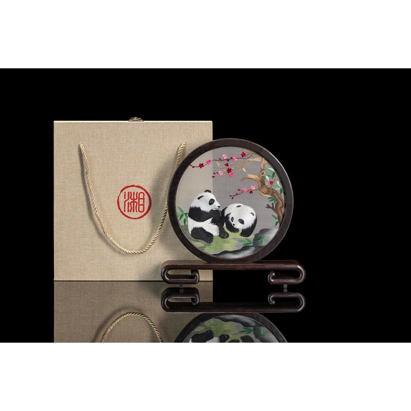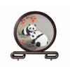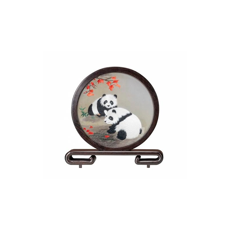 Ebherys Hand Embroidery Art, 8” Glass Round Screen for Desk Top, Handmade Needlework on Silk Mat with Solid Wood Frame, Two Sides with Same Image Chinese Panda for Home and Office Decor (Maple Panda)
