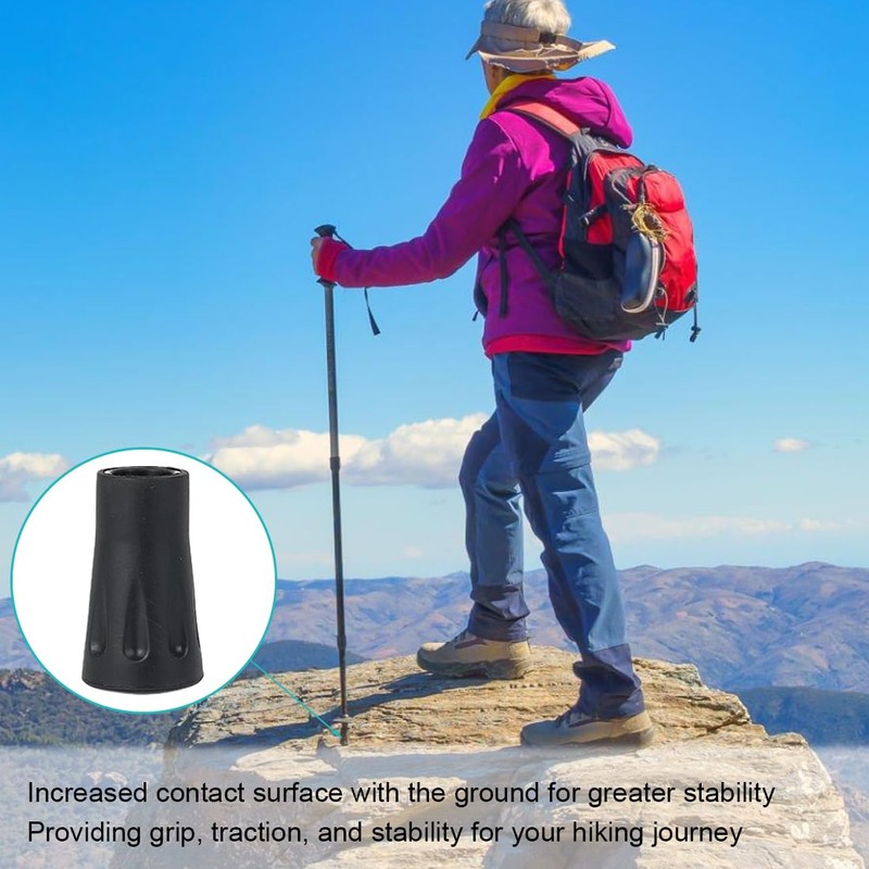 Product size: the size of each rubber foot pad for hiking poles is approx. 2.3 x 2.3 x 4 cm (0.9 x 0.9 x 1.57 inches) with an inner diameter of 1.1 cm (0.43 inches) and is suitable for most standard size trekking poles. Please confirm the product size before purchasing.