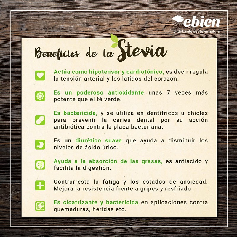 - ✔ La hoja de Stevia Pulverizada ebien proviene de la hoja seca fina seleccionada de manera artesanal para su posterior pulverización. Nuestra Stevia es de origen 100% mexicano y se encuentra sanitizada y lista para su consumo.