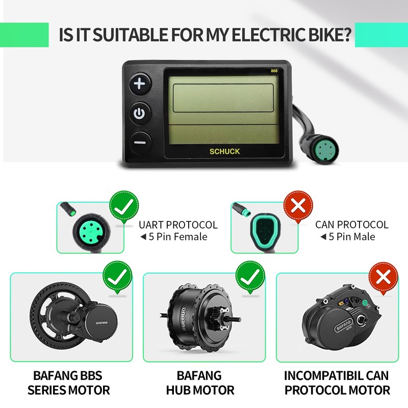 - BBS01 BB02B BBSHD center motor, but cannot be compatible with wheel hub motor controller