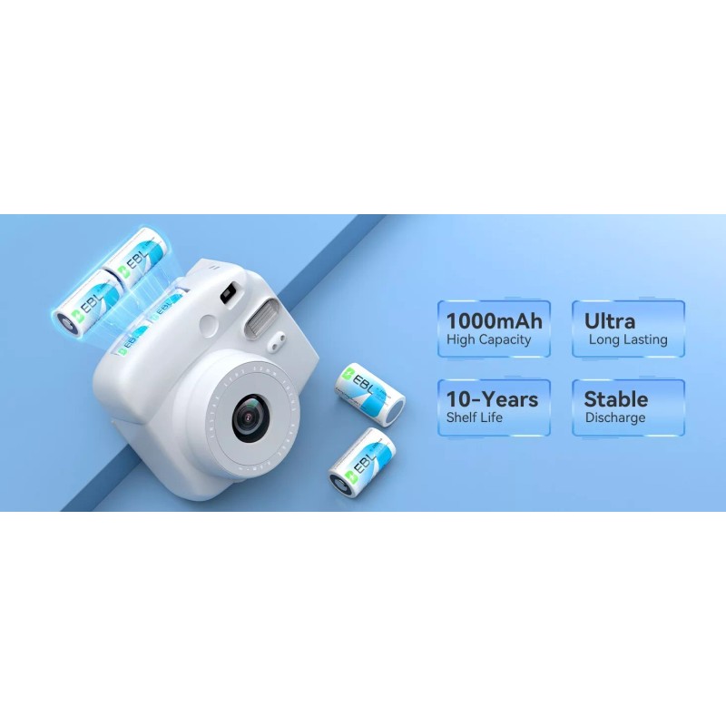 【EBL CR2 Lithium Battery】Voltage: 3V, Capacity: 1000 mAh, Longer shelf life- 10 years. It is Non-rechargeable and lasts 3-5 times longer than alkaline batteries. Make your high drain devices (such as digital cameras) work longer and record more.