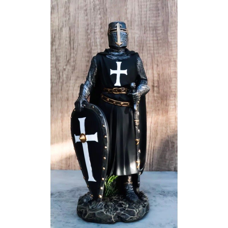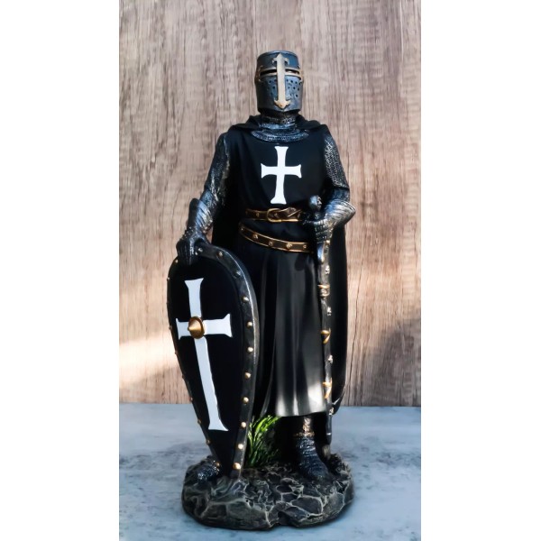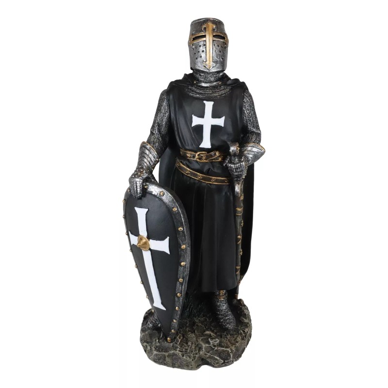 • A classical interpretation of a resting medieval warrior, the Fearless Crusader Knight Statue features the attire of a knightly Crusader wearing Templar robes. This knight wears a bronze-trimmed great helm and suit of mail armor. Over the armor, this knight wears a black surcoat with a white cross and a cape. The knight also has a black kite shield decorated with a cross and a longsword in a scabbard, both of which are resting with the knights hand keeping them balanced.
