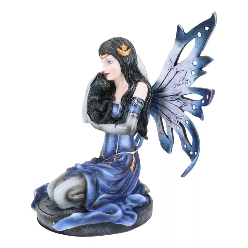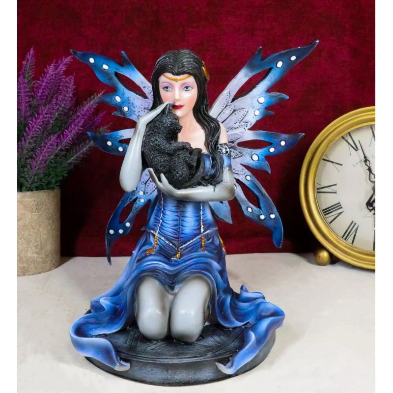 Ebros Blue Celestial Witch Fairy Cradling A Mystical Black Cat Statue 8.25" Tall