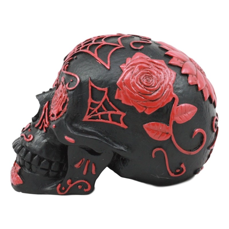 - Decorate your home for the halloween, day of the dead season or any season with this skull. This skull is cast in black medium color for a dark sharp contrast against the ornate detailed designs in red color. The designs on the tattoo features a combination of spider webs, large rose and other beautiful flowers in their vines. He makes a perfect small altar decoration as well as desktop buddy!