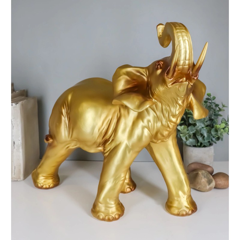 • This Majestic Feng Shui Golden Elephant With Its Trunk Up Statue is made of designer composite resin, hand painted and polished in golden finish. Color Tone may vary.