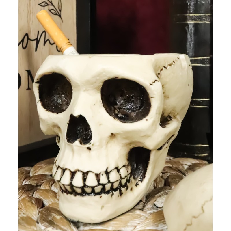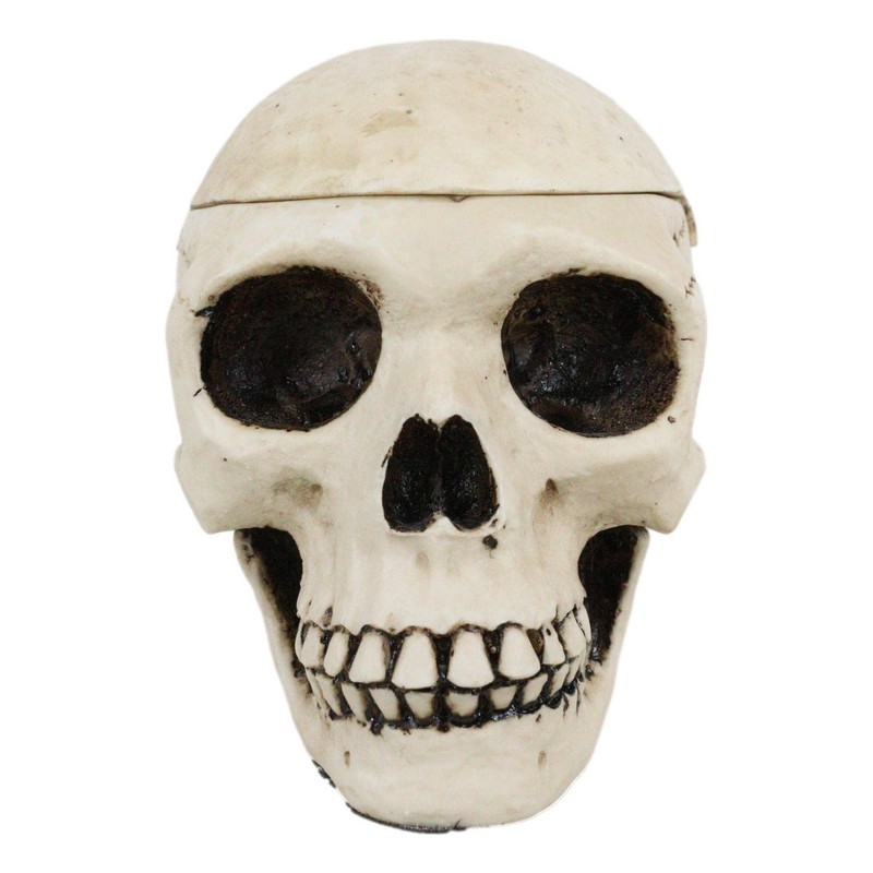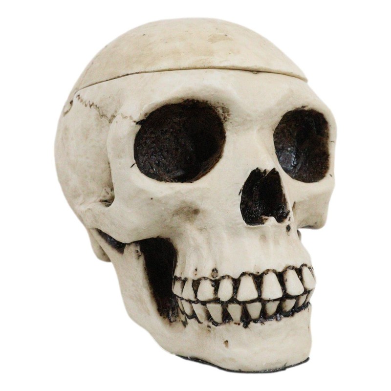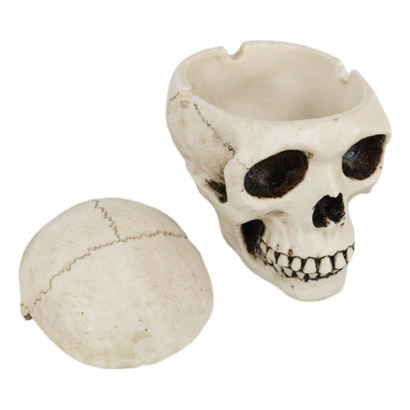 - This Human Skull Ashtray has a lid cap to prevent the cigarette ash from blowing all over your furniture when you are not using the ashtray. You can also use this skull as a jewelry box, key holder or what have you. Celebrate the day of the dead spirit with this Human Skull ashtray.