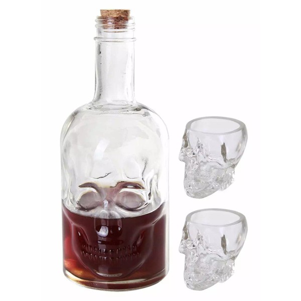 • This Dark Underworld Skull Decanter is made of thick solid high quality glass, and can hold 30oz(885ml) of liquid beverage. The decanter comes with a cork stopper. The skull face is designed on two sides of the glass bottle decanter giving it a cool skull appearance on both front and back angles.