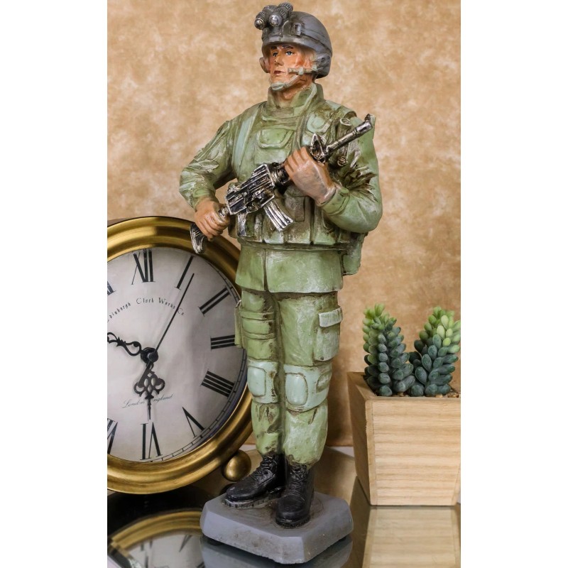 • This is an inspirational figurine of a soldier standing on guard, carrying a rifle. He is fully armored with bulletproof vest, deployment backpack, helmet and ammo belt. It makes the perfect gift for those in combat service for our country.